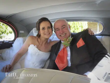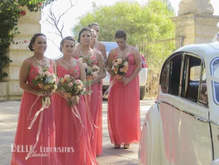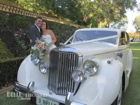 Emily’s father surprised her with a classic Jaguar Mk5 bridal car for her wedding at Caversham House in the Swan Valley. The large wedding party and international guests were chauffeured to the wedding in Chrysler limos.